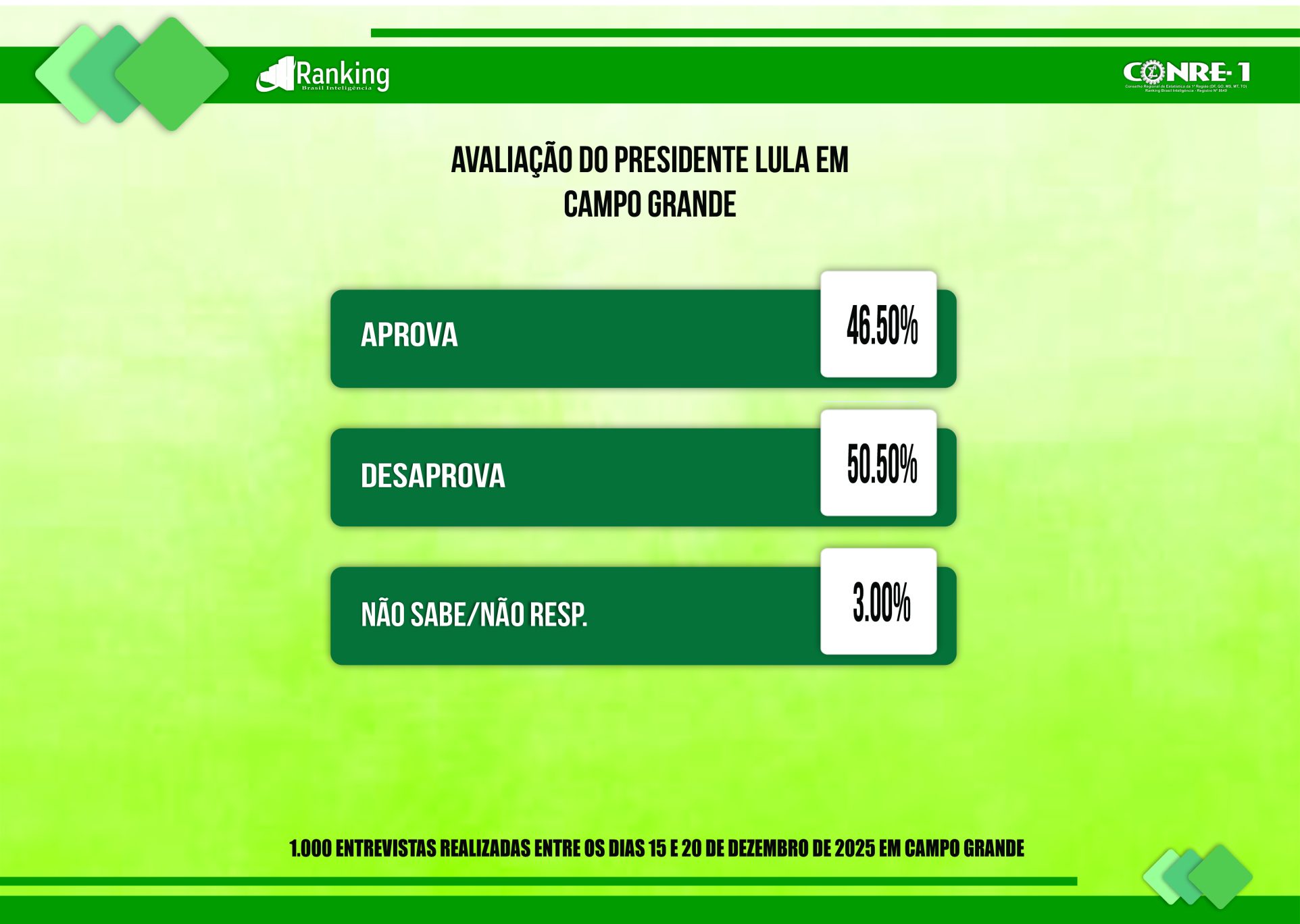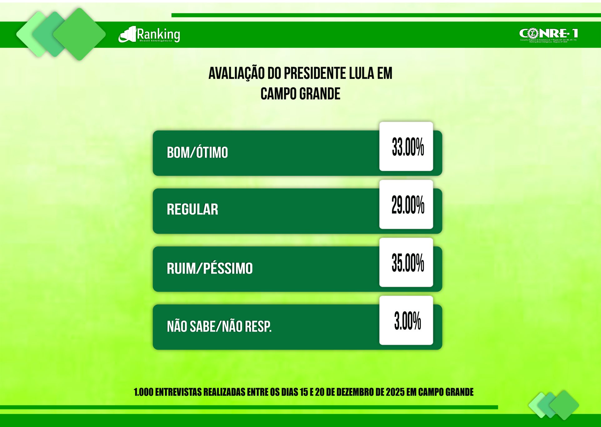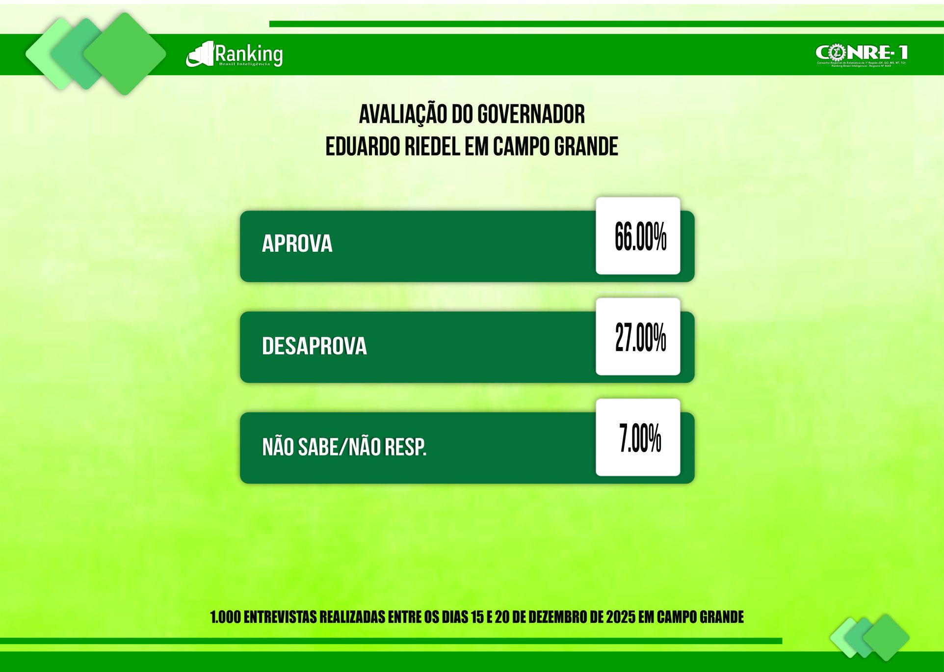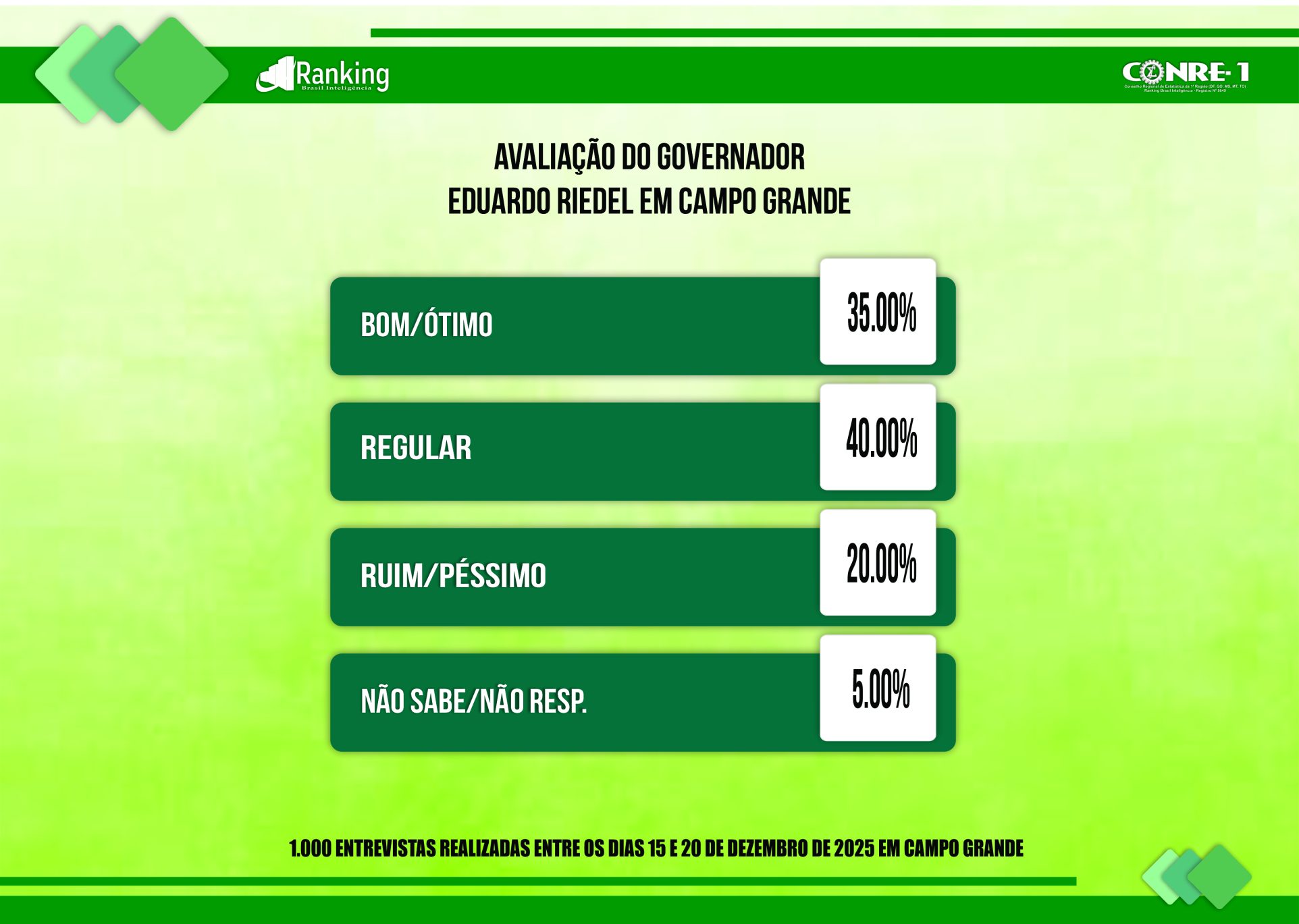 Por encomenda da Rede de Rádios Top FM, a pesquisa realizada pelo Instituto Ranking Brasil Inteligência, de 15 a 20 de dezembro deste ano, junto a 1.000 eleitores, com 16 anos ou mais de idade, nas sete regiões urbanas de Campo Grande (MS) e nos distritos de Anhandui, Rochedinho e zona rural, com intervalo de confiança de 95% e margem de erro de 3 pontos percentuais para mais ou para menos, traz a avaliação do governador Eduardo Riedel (PP).